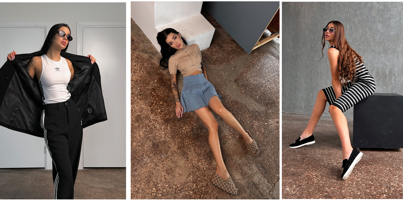 Футболки, платья, спортивные костюмы, а также другая одежда, обувь и аксессуары.