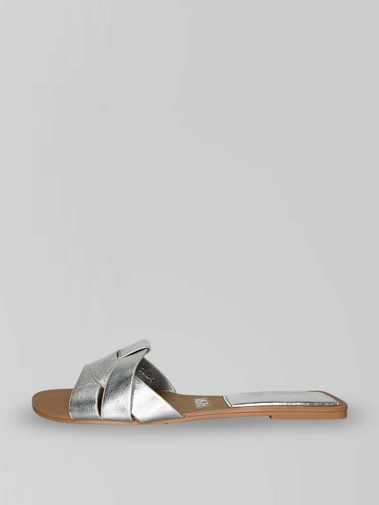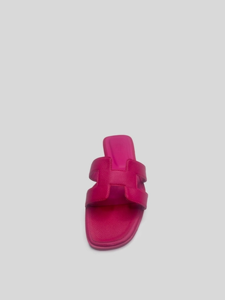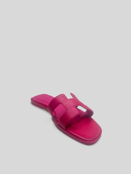 - Мюли – остроносые модели без пятки, напоминающие восточные туфли. Стильные модели для создания потрясающих уличных и пляжных луков, украшенные ярким декором в виде металлических пряжек или контрастных вставок. Недаром многие модницы стремятся купить женские шлепанцы этого типа для пляжного отдыха или поездки на курорт.