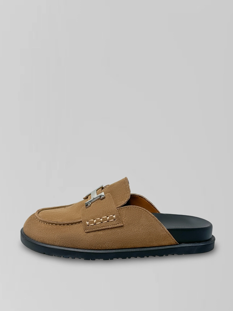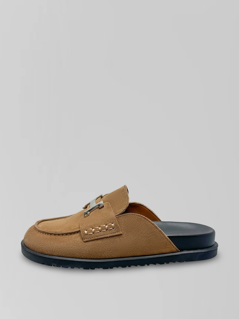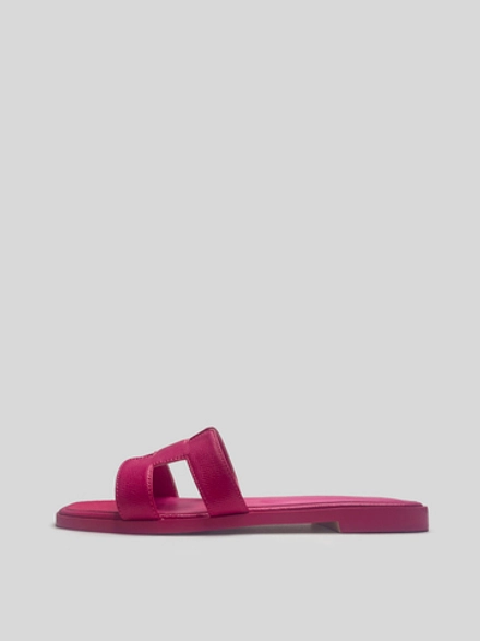 - Мюли – остроносые модели без пятки, напоминающие восточные туфли. Стильные модели для создания потрясающих уличных и пляжных луков, украшенные ярким декором в виде металлических пряжек или контрастных вставок. Недаром многие модницы стремятся купить женские шлепанцы этого типа для пляжного отдыха или поездки на курорт.