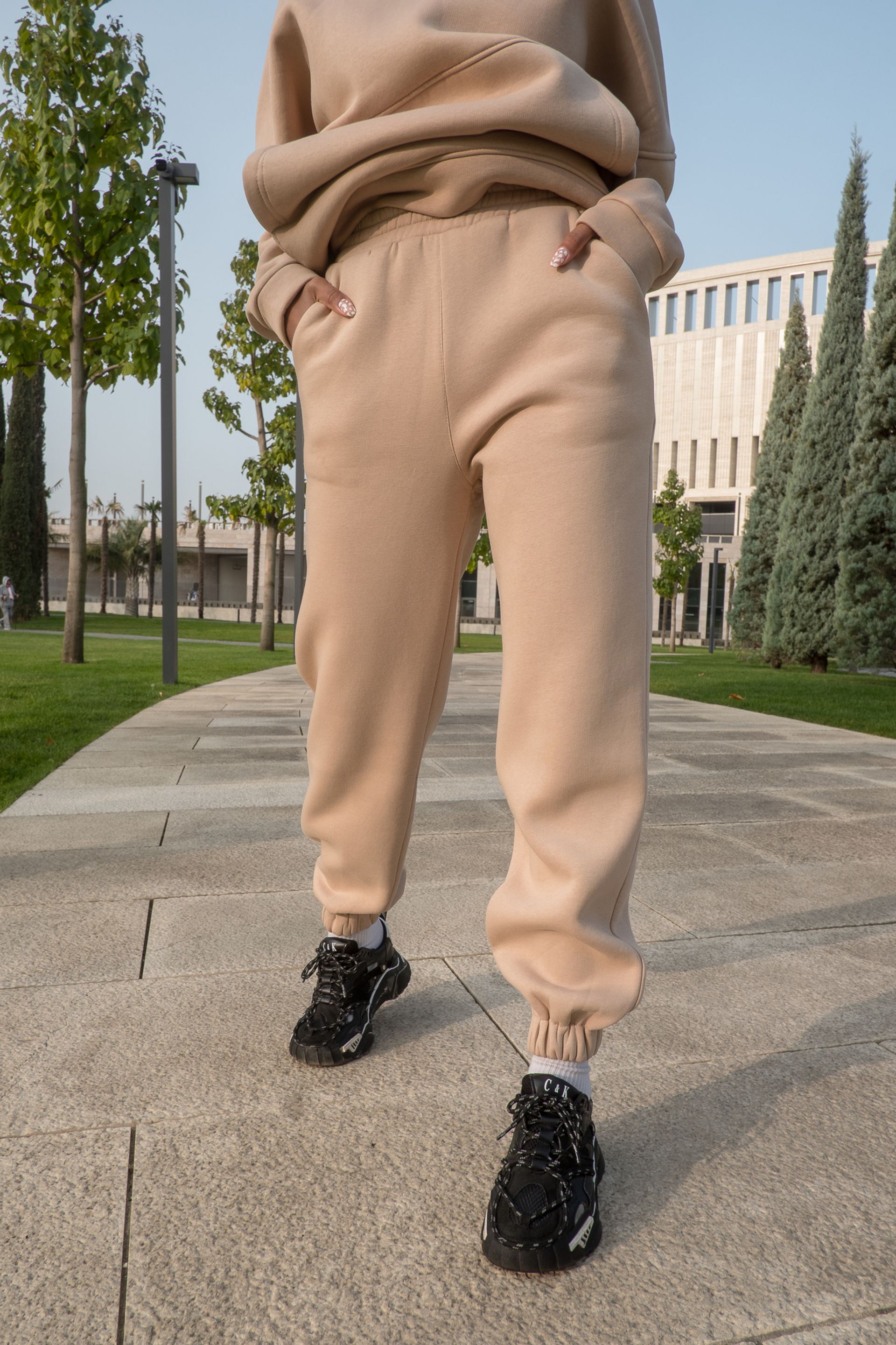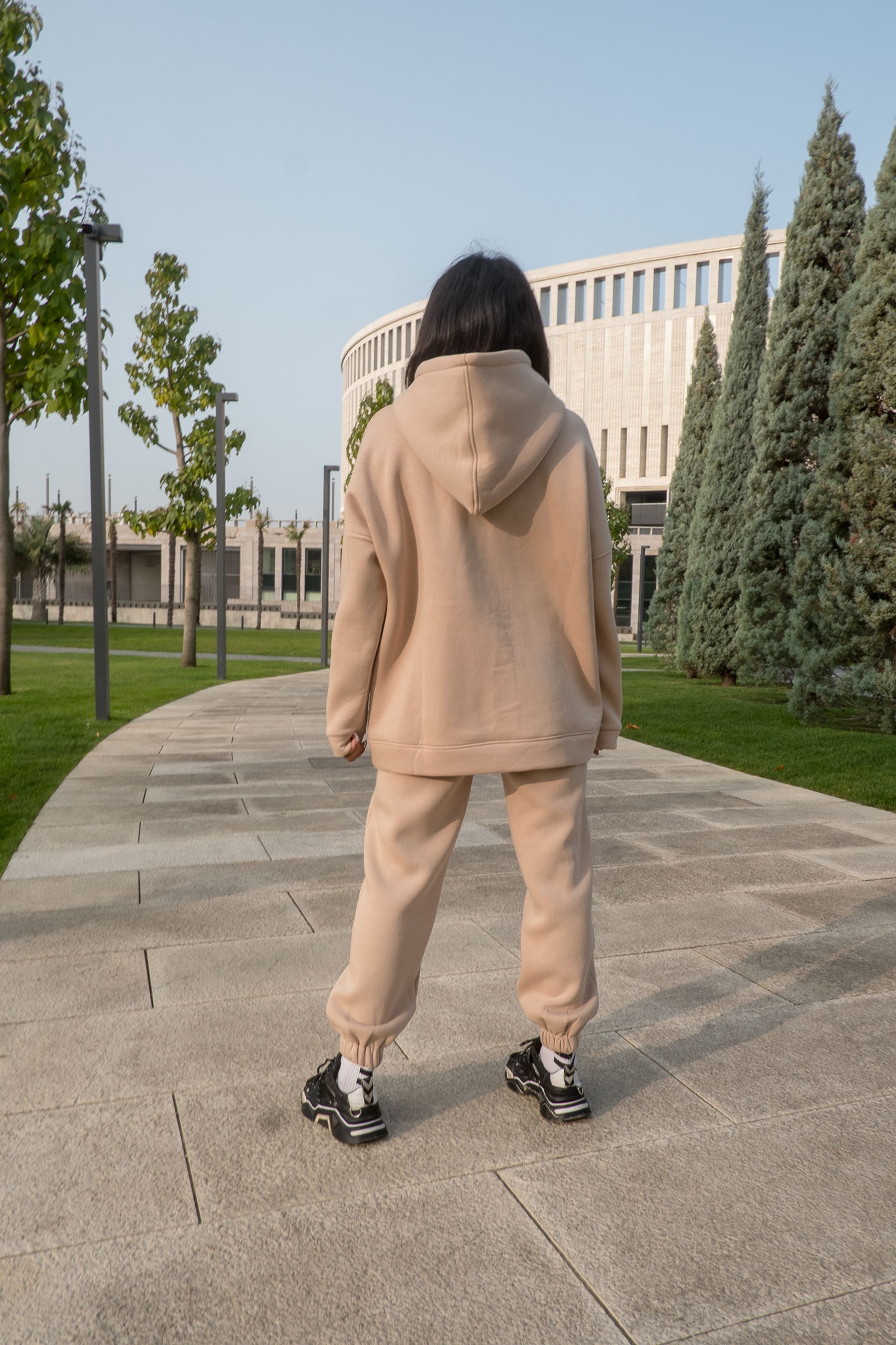 Женский спортивный костюм бежевого цвета из трикотажа с утеплителем из флиса, с карманом на толстовке и капюшоном