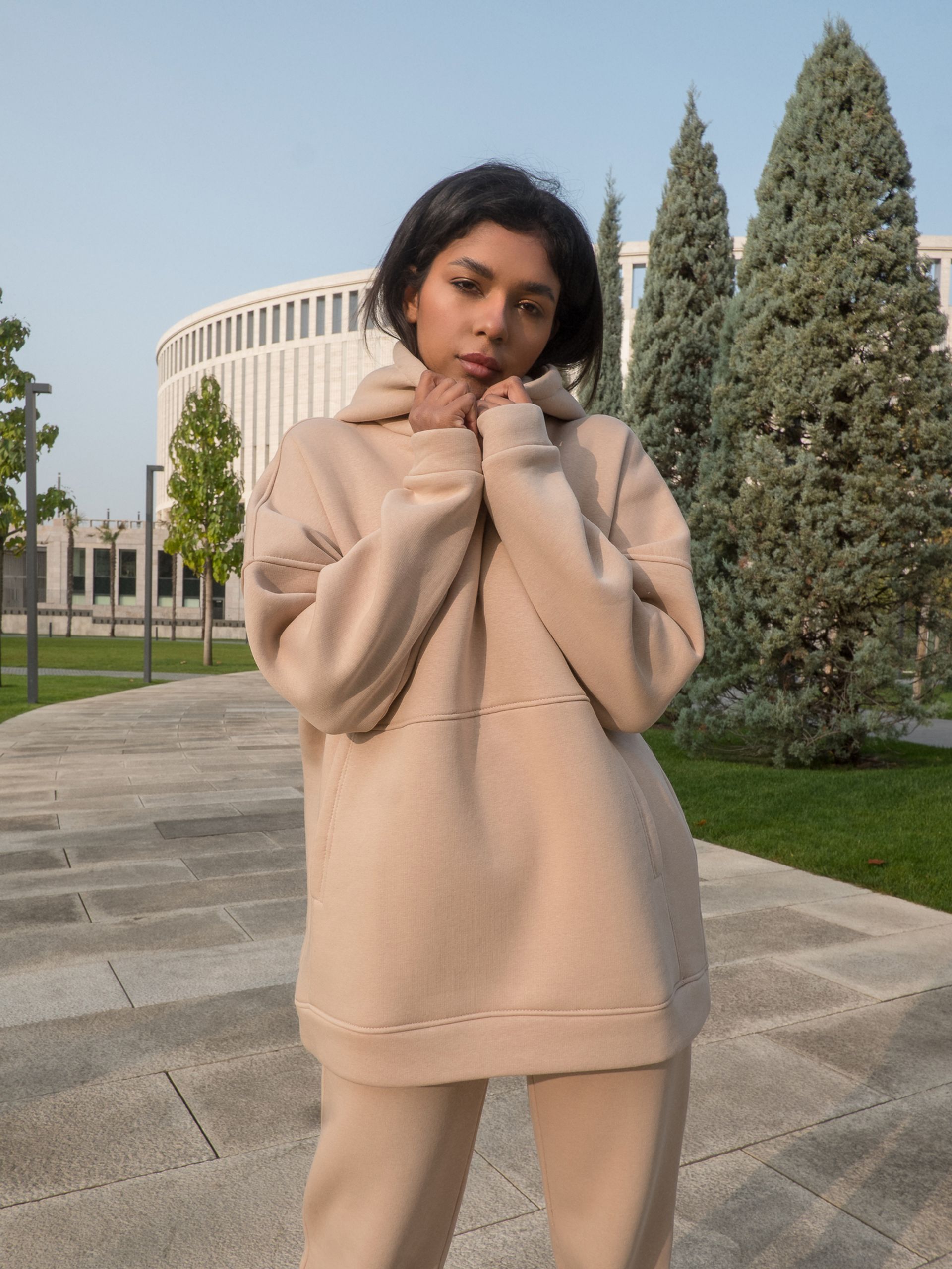 Женский спортивный костюм бежевого цвета из трикотажа с утеплителем из флиса, с карманом на толстовке и капюшоном