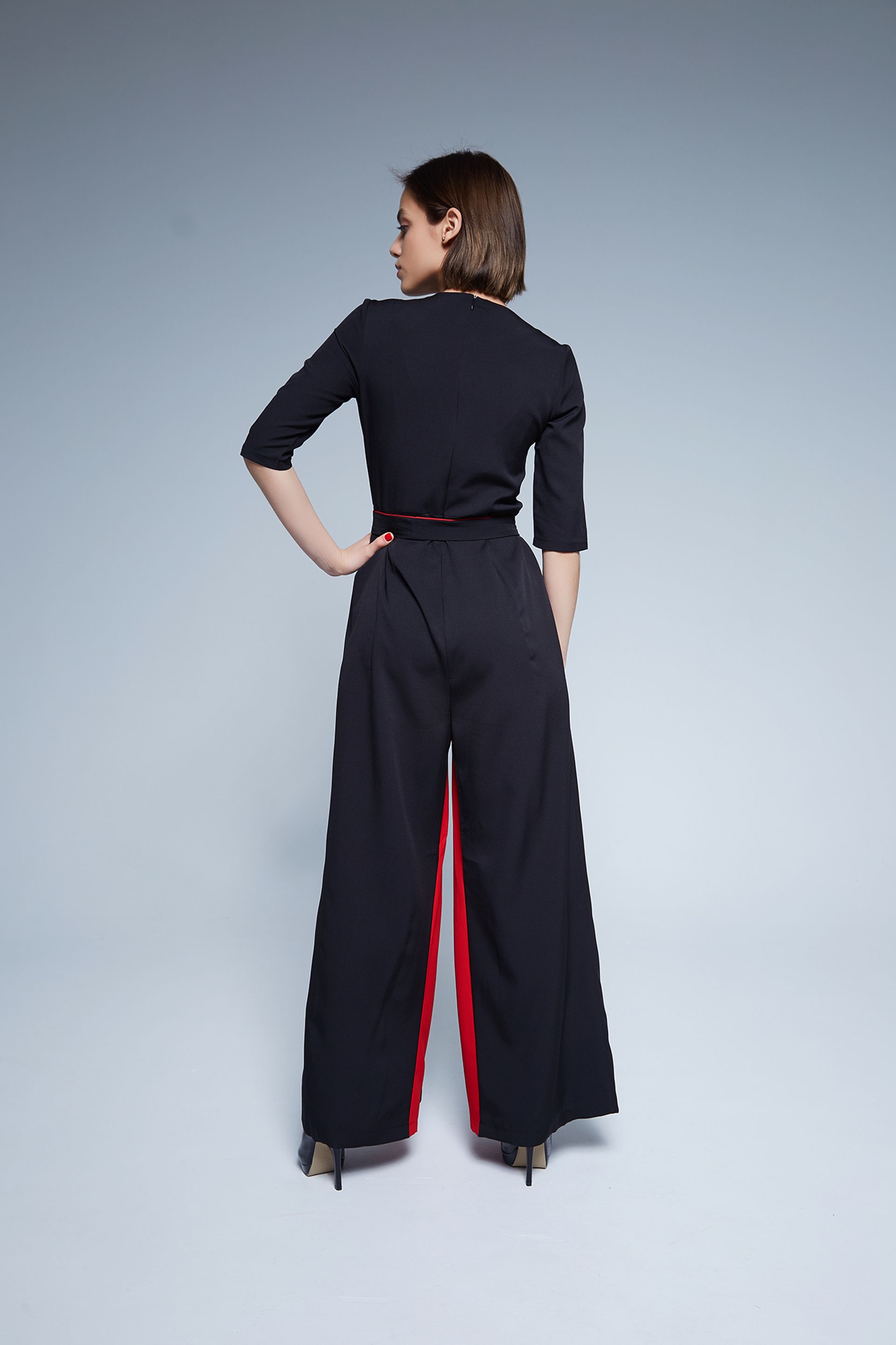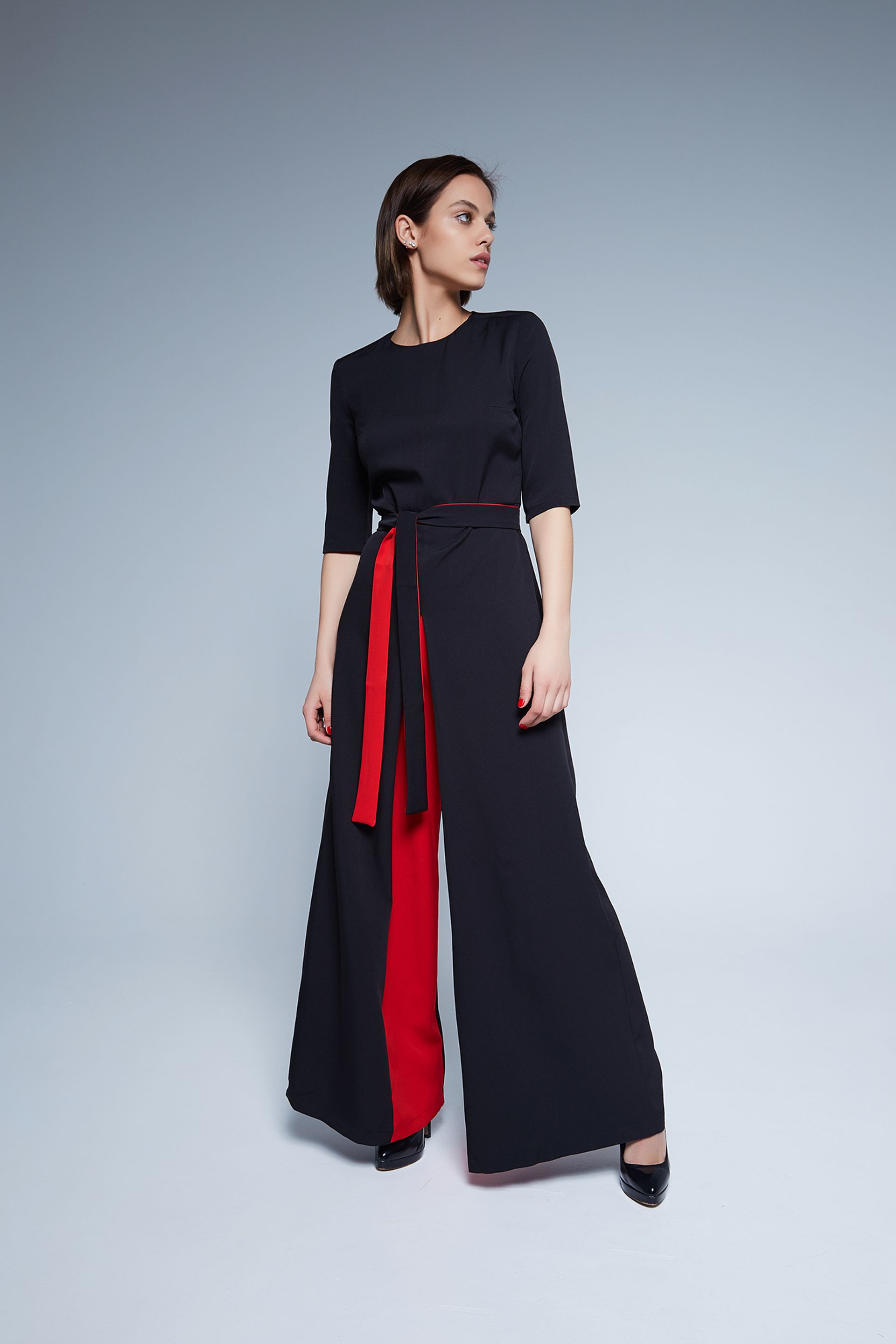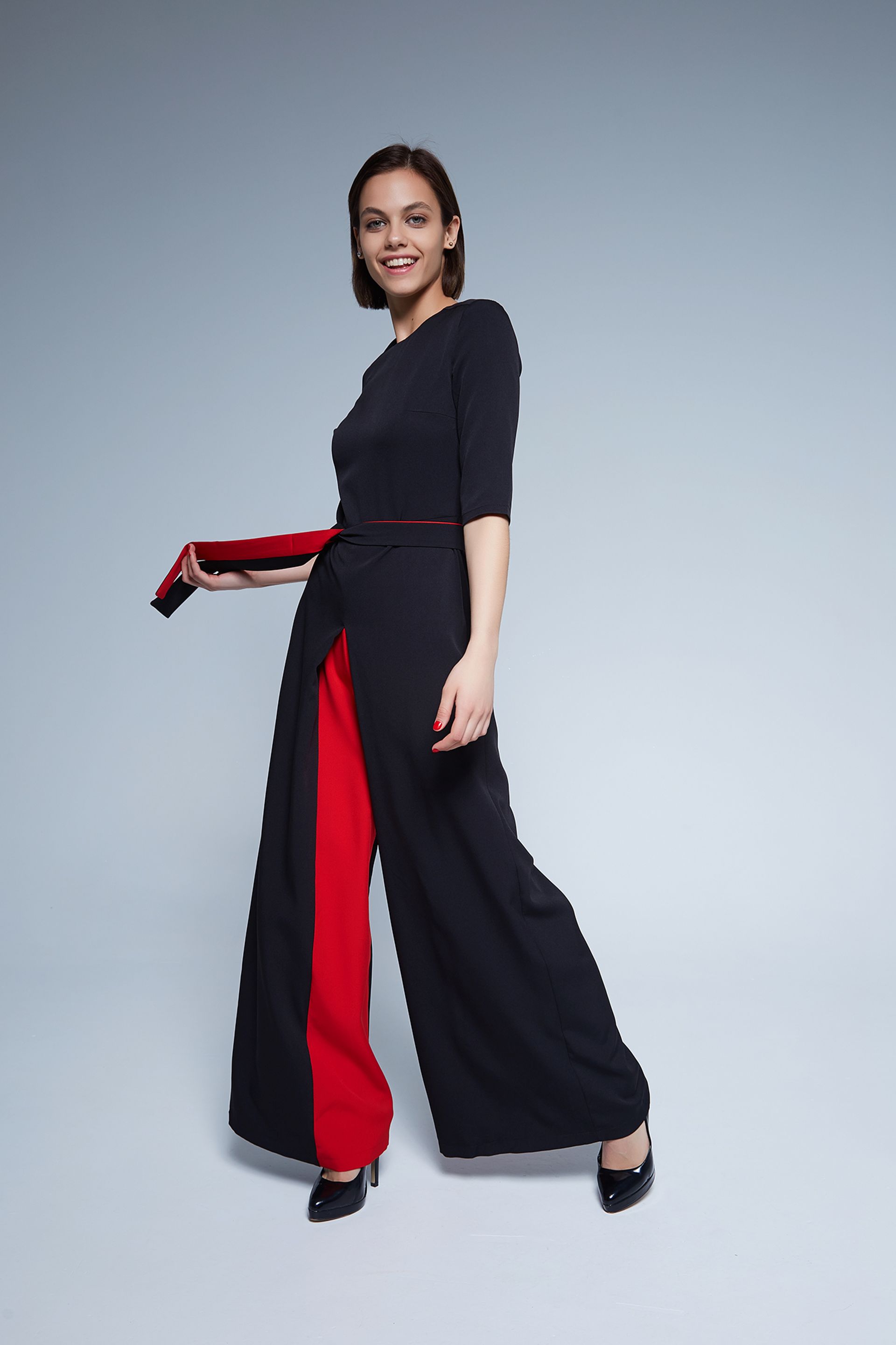 Двухцветный (красным с черным) женский комбинезон с брюками из поливискозы с поясом