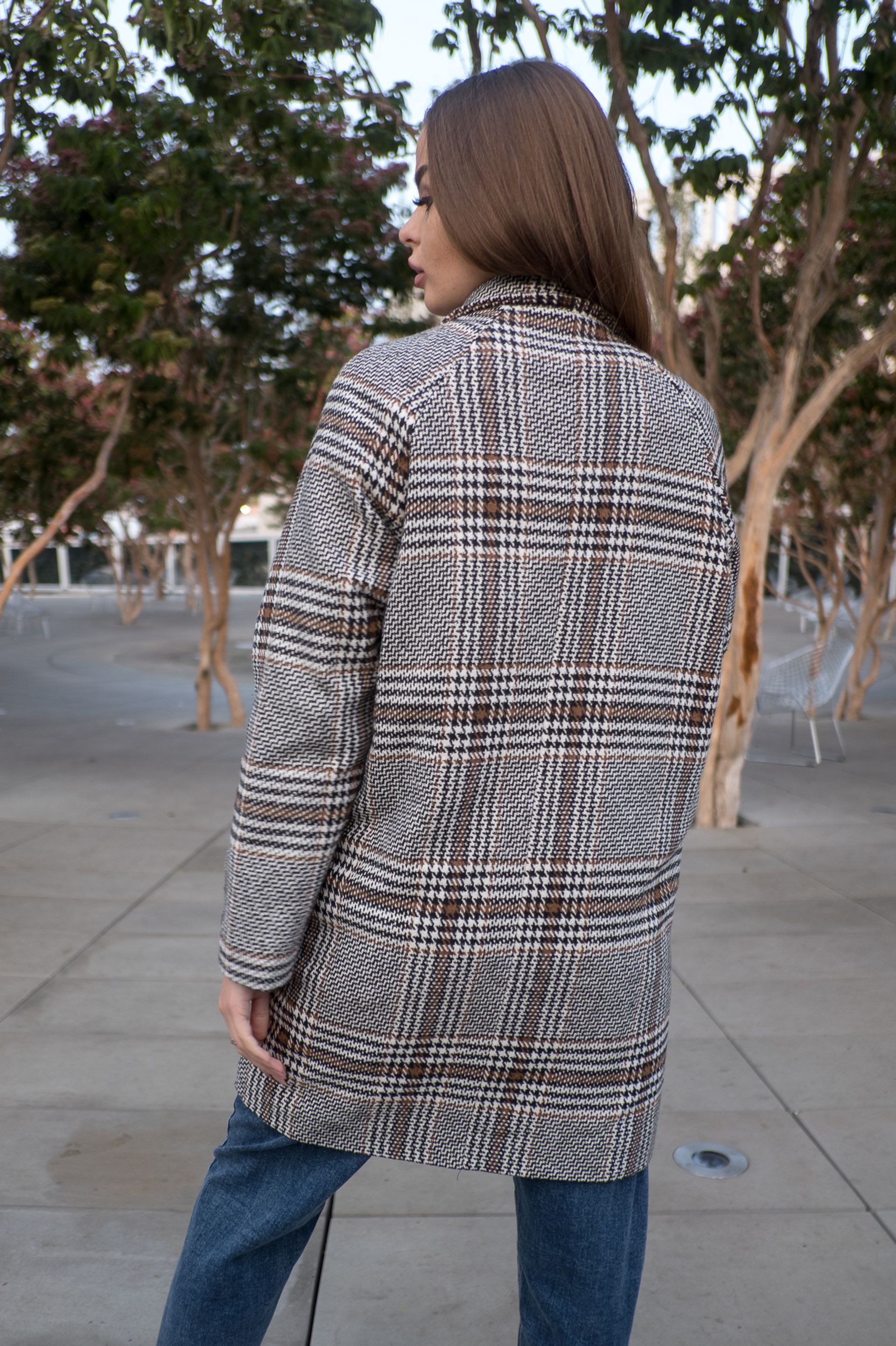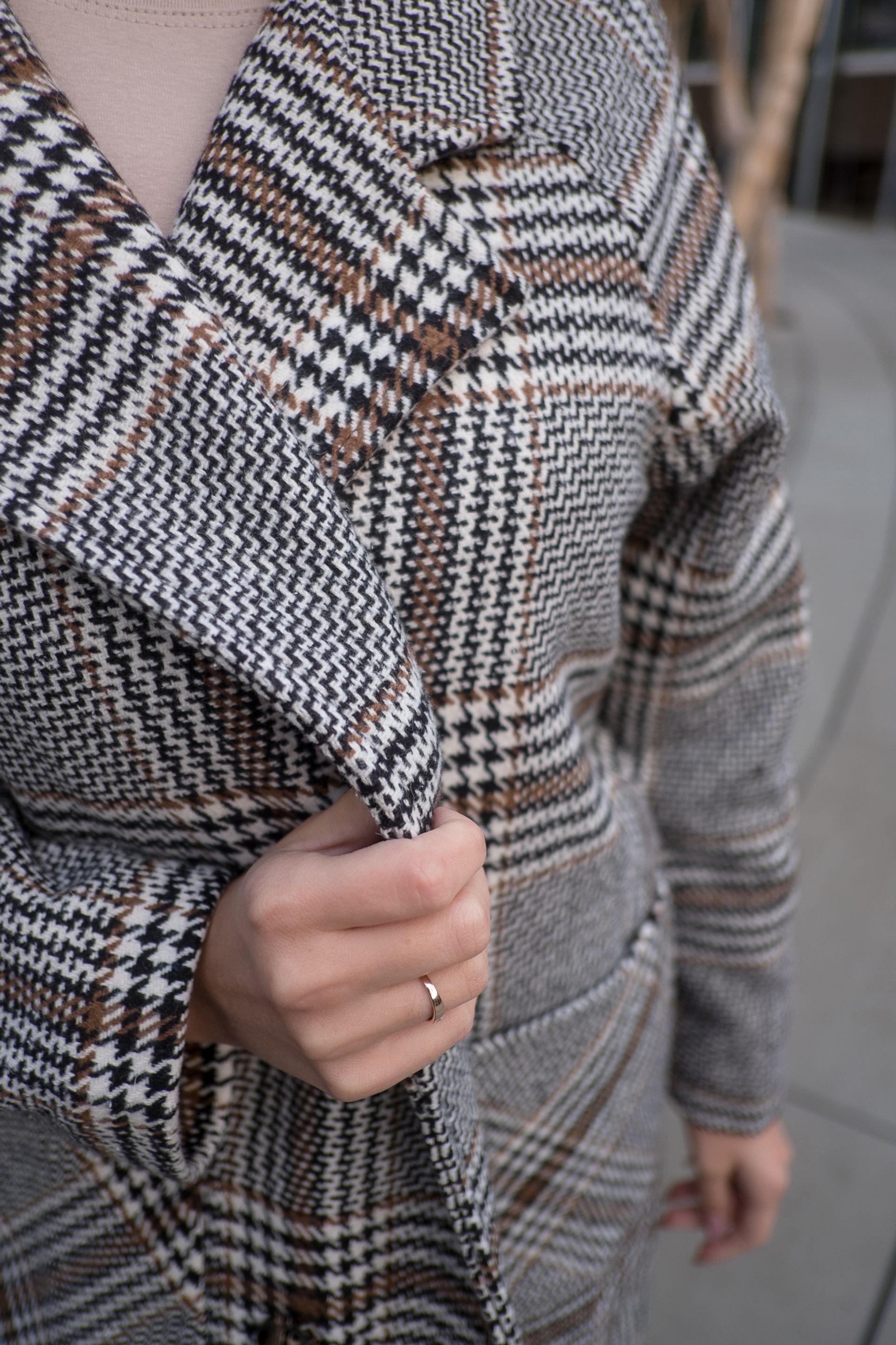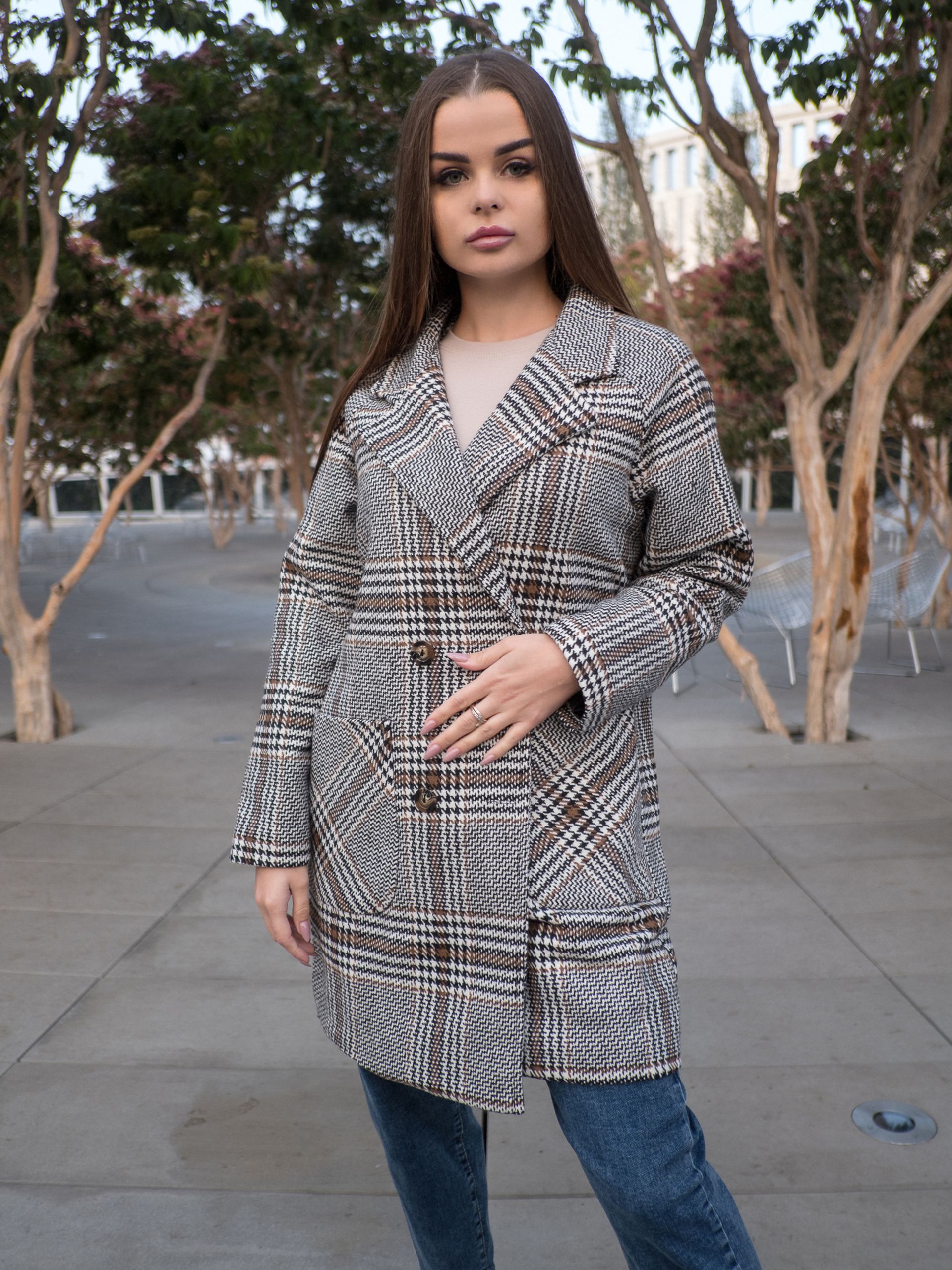 Женское пальто коричневого цвета из кашемира и синтепона, на пуговицах, в полоску, средней длины
