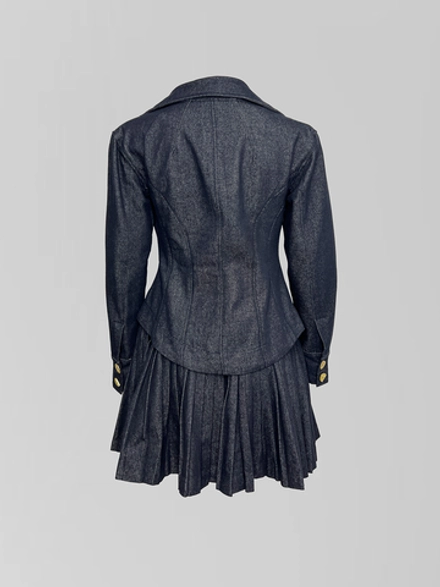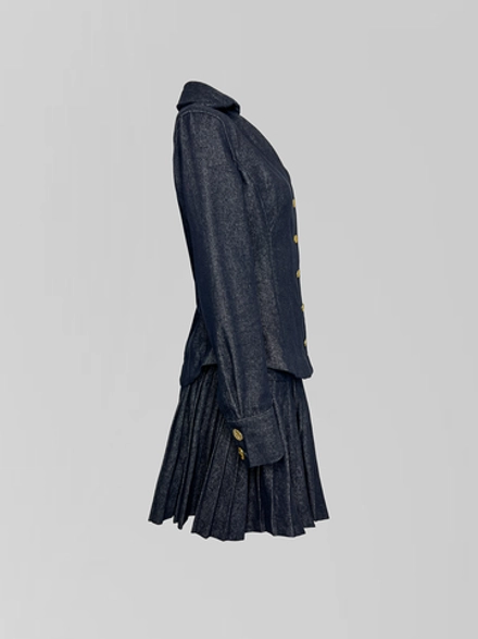Этот демисезонный комплект, сотканный из практичного союза хлопка и полиэстера, создан для того, чтобы сопровождать Вас в повседневной жизни, effortlessly наполняя ее утонченной элегантностью. Пиджак, с его строгими линиями и классическими пуговицами, не просто следует канонам стиля, но и предлагает функциональность благодаря трем накладным карманам, где можно разместить необходимые мелочи. Короткая юбка завершает силуэт, делая его динамичным и целостным. Лаконичные нашивки бренда служат финальным акцентом, подчеркивая продуманность каждой детали.
