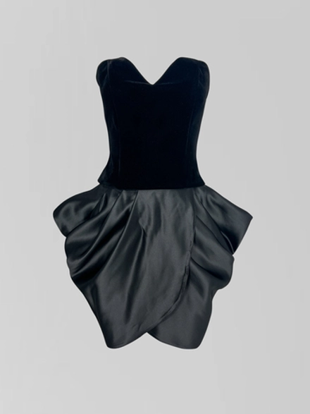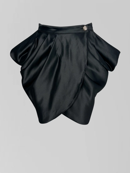 В основе образа — корсет без лямок, застегивающийся на молнию. Его конструкция обеспечивает безупречную посадку по фигуре, мягко подчеркивая силуэт, не сковывая движений. Второй аккорд — струящаяся атласная юбка, украшенная изящными защипами. Этот элемент придает всему облику объем и легкую воздушность, создавая игру света на поверхности благородной ткани.