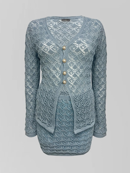 Костюм Luna Style состоит из кофточки на пуговицах и короткой юбки, сшитых из смесовой ткани (хлопок и полиэстер). Это гарантирует приятные тактильные ощущения, воздухопроницаемость и устойчивость к деформации даже при активной носке. Вязаная фактура добавляет образу утончённости, а однотонное исполнение делает комплект идеальной основой для любых сочетаний.