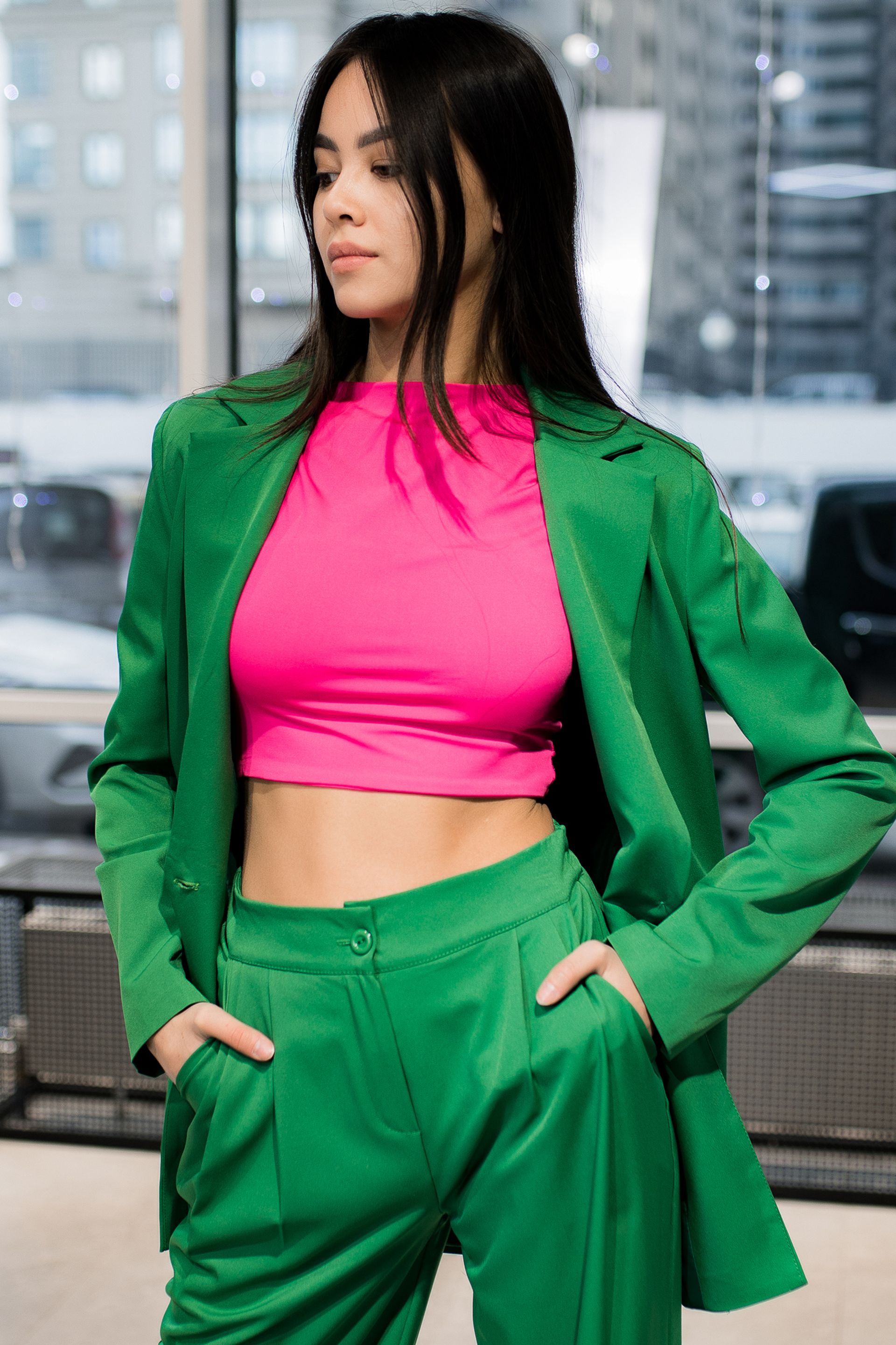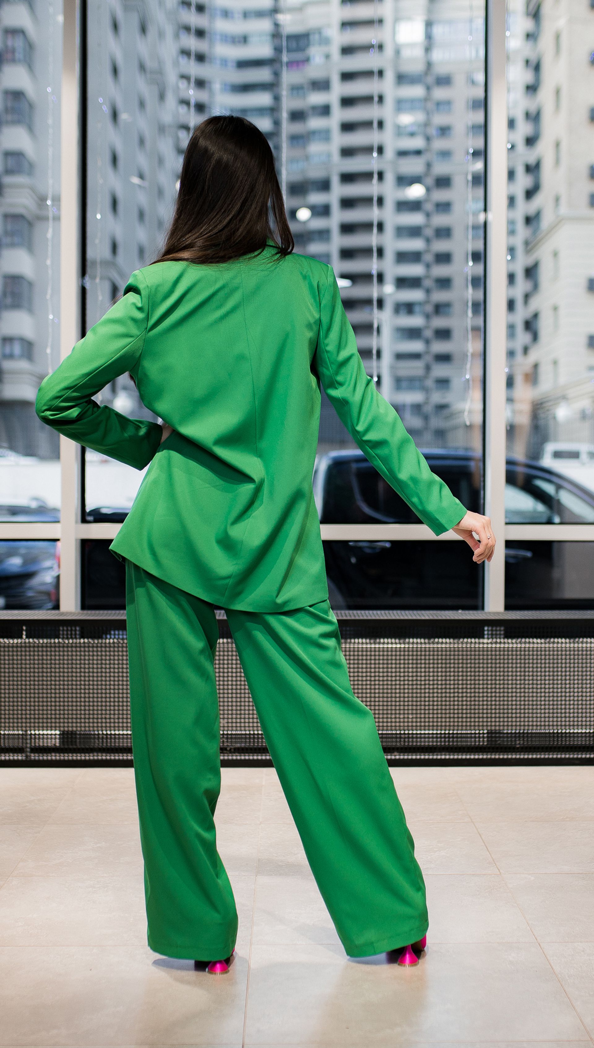 Женский брючный костюм из поливискозы зеленого цвета с широкими штанами, пиджаком с застежкой пиджака на одну пуговицу и двумя карманами