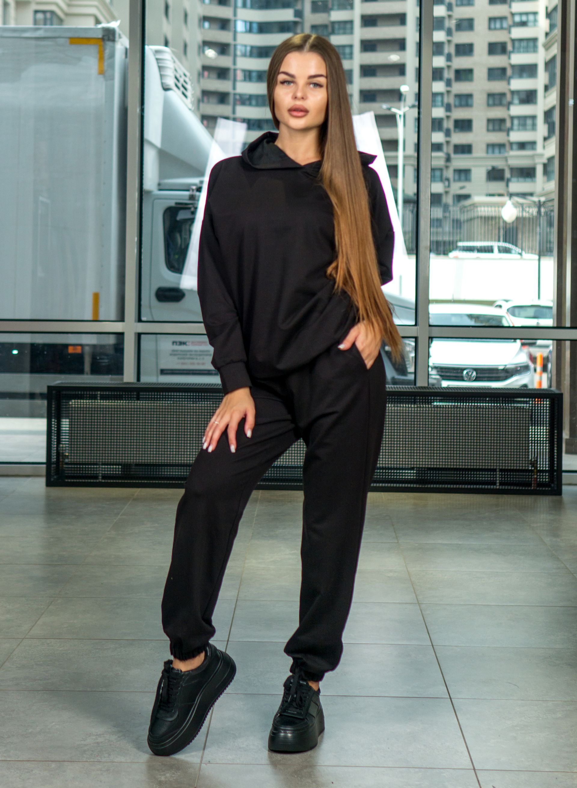 Женский костюм тройка из топа, толстовки и штанов из двунитки черного цвета.