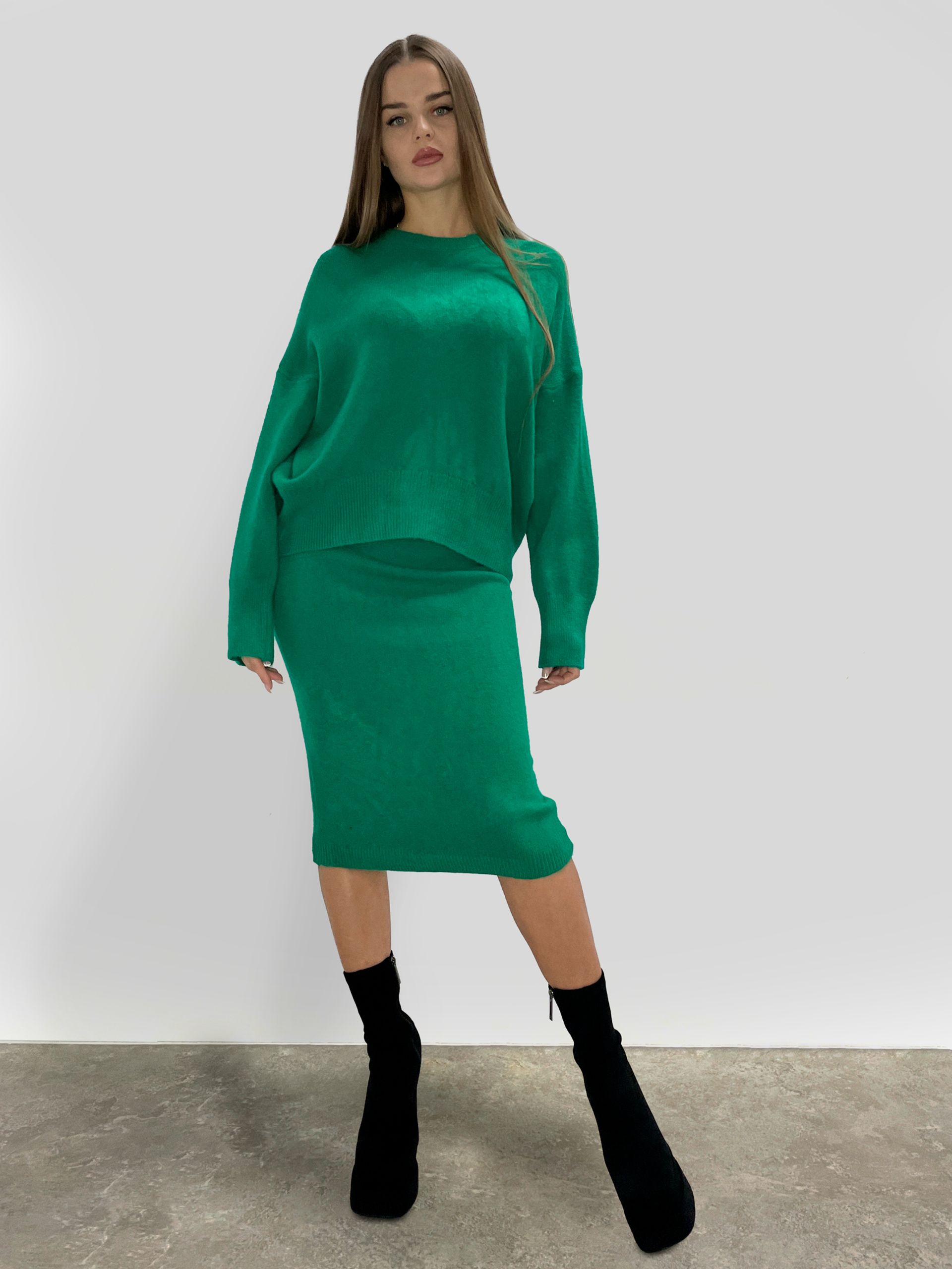 Костюм трикотажный JN 8812 однотонный из свитера и прямой юбки\Зеленый