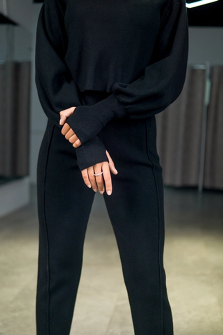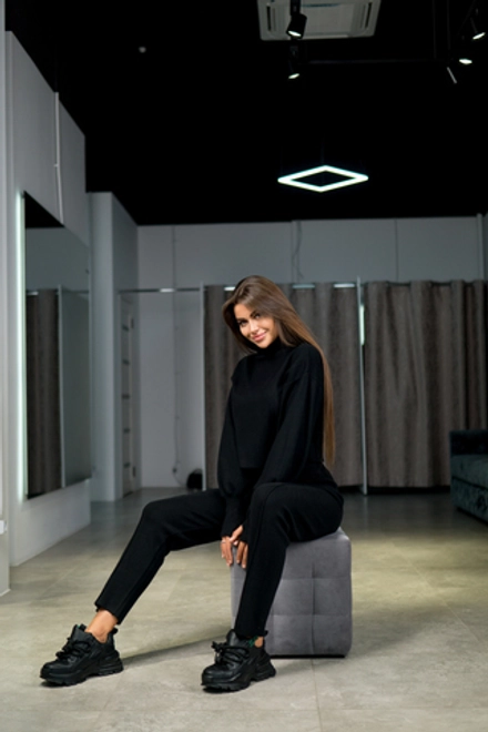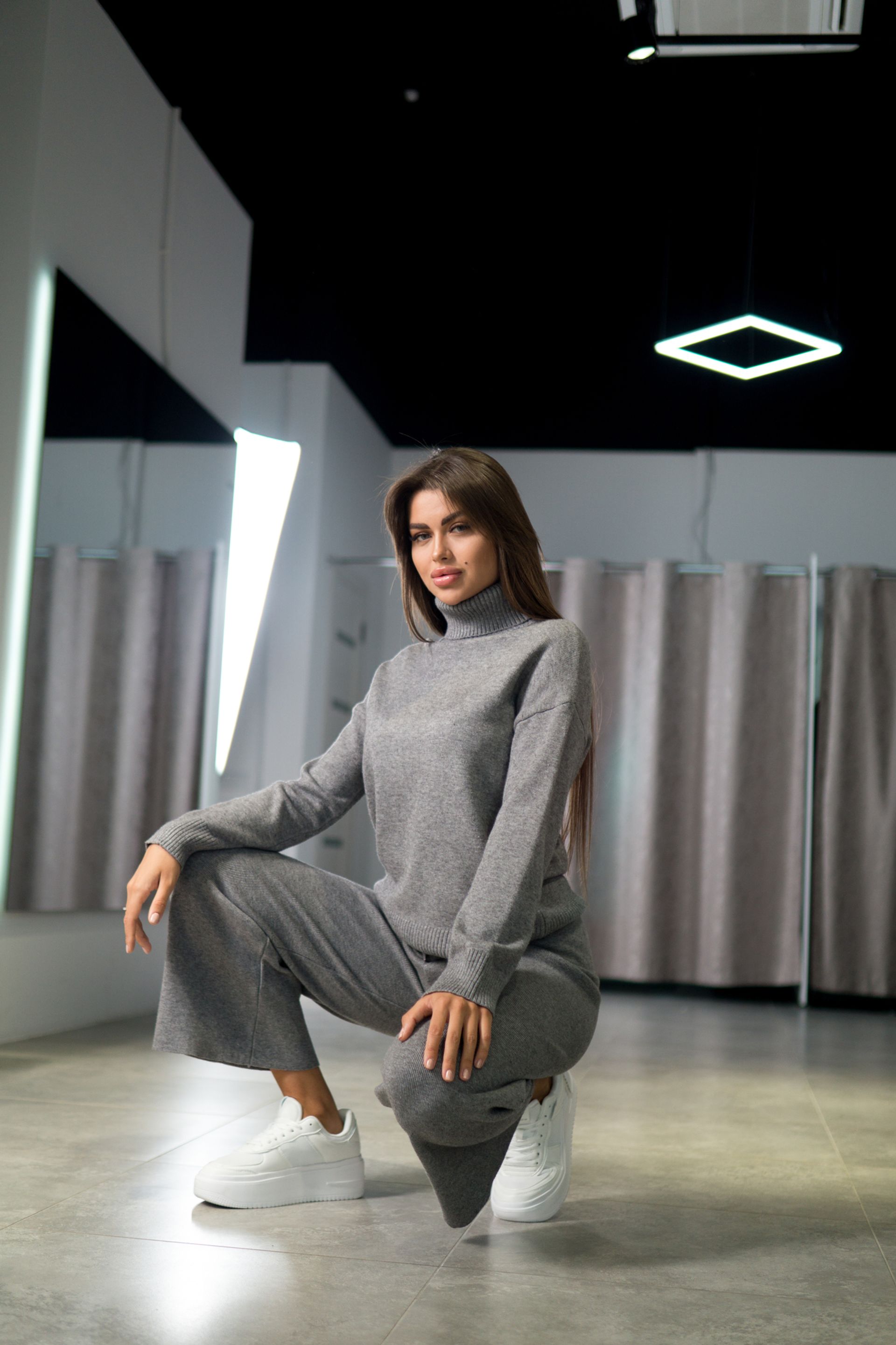 Женский теплый костюм из трикотажа серого цвета, с высоким горлом и штанами клеш