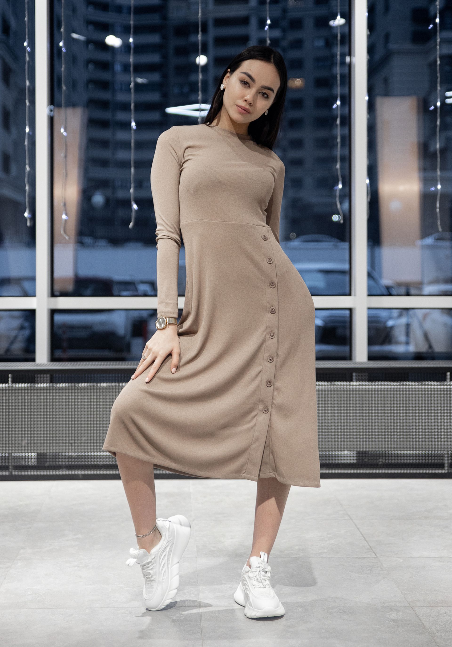 Одним из главных преимуществ данного платья является его застежка. Пуговицы расположены на талии, что позволяет платью идеально сесть по фигуре. Благодаря этому, платье подчеркивает достоинства Вашей фигуры и скрывает возможные недостатки.