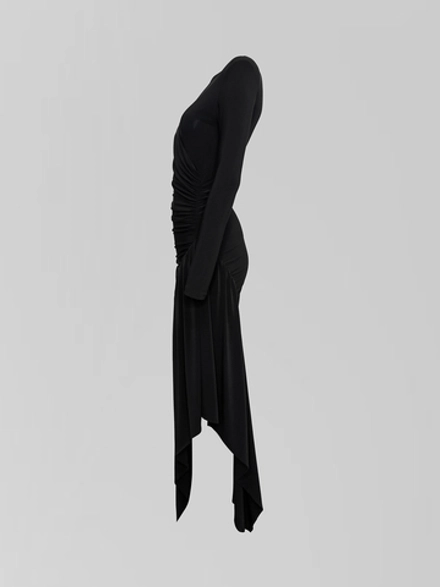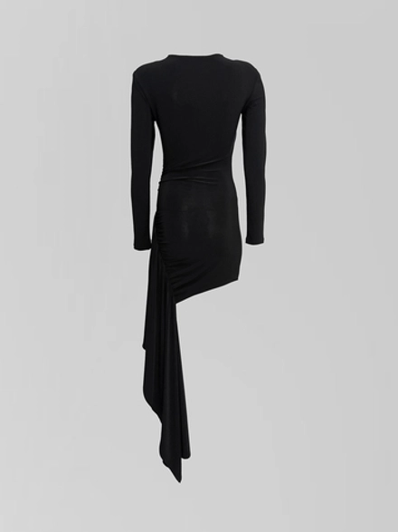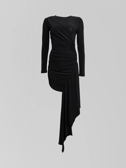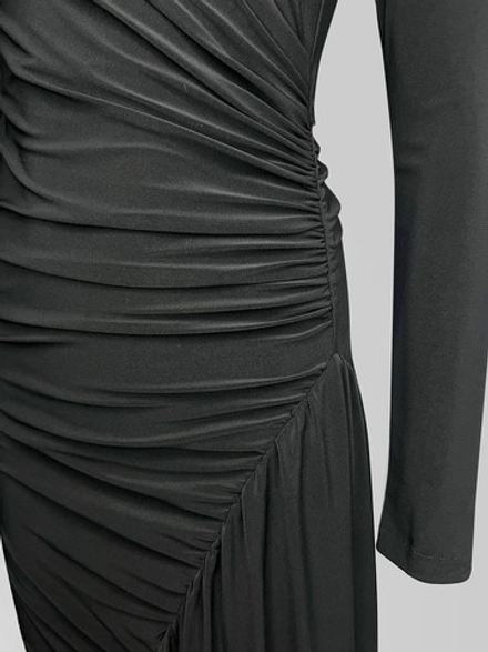 Силуэт платья мастерски выстроен, подчеркивая естественные линии фигуры благодаря облегающему крою, который не стесняет движений. Игра фактур и форм проявляется в детали, ставшей центральным акцентом: перекрученная ткань создает современный скульптурный объем, добавляя образу динамику и индивидуальность. Разрез сбоку, продуманный и элегантный, вносит ноту непринужденности, балансируя между строгостью длинного рукава и классическим круглым вырезом горловины.