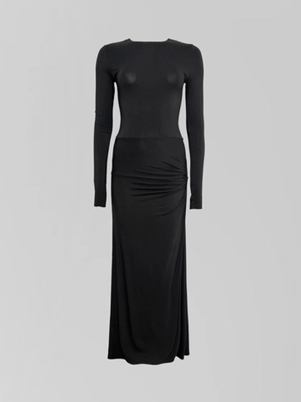 Силуэт платья мастерски выстроен, подчеркивая естественные линии фигуры благодаря облегающему крою, который не стесняет движений. Игра фактур и форм проявляется в детали, ставшей центральным акцентом: перекрученная ткань создает современный скульптурный объем, добавляя образу динамику и индивидуальность. Разрез сбоку, продуманный и элегантный, вносит ноту непринужденности, балансируя между строгостью длинного рукава и классическим круглым вырезом горловины.