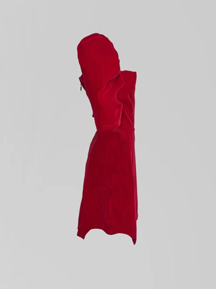 Главная особенность — изящная шнуровка на спине. Она не просто служит элементом декора, но и позволяет регулировать посадку, создавая индивидуальный силуэт. Застежка-молния, выполненная аккуратно и надежно, гарантирует удобство, а круглый вырез горловины завершает лаконичную композицию, делая акцент на лице.