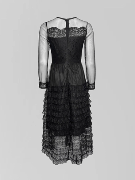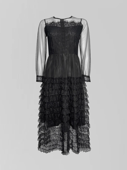 Но истинная поэзия этого платья раскрывается в деталях. Изысканная отделка кружевом, размещенная вдоль задней молнии, превращает простой замысел в произведение портновского искусства. Эта молния — не просто функциональный элемент, а часть декора, который преображает образ, добавляя интригующую изюминку. Застегивая ее, Вы завершаете создание безупречного вечернего ансамбля.