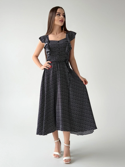 Сшитое в Киргизии из воздушного шифона, оно словно создано для летних дней и тёплых вечеров. Мягкая драпировка на груди добавляет образу лёгкую элегантность, а длина ниже колена делает платье уместным как для прогулки под солнцем, так и для торжественного события.