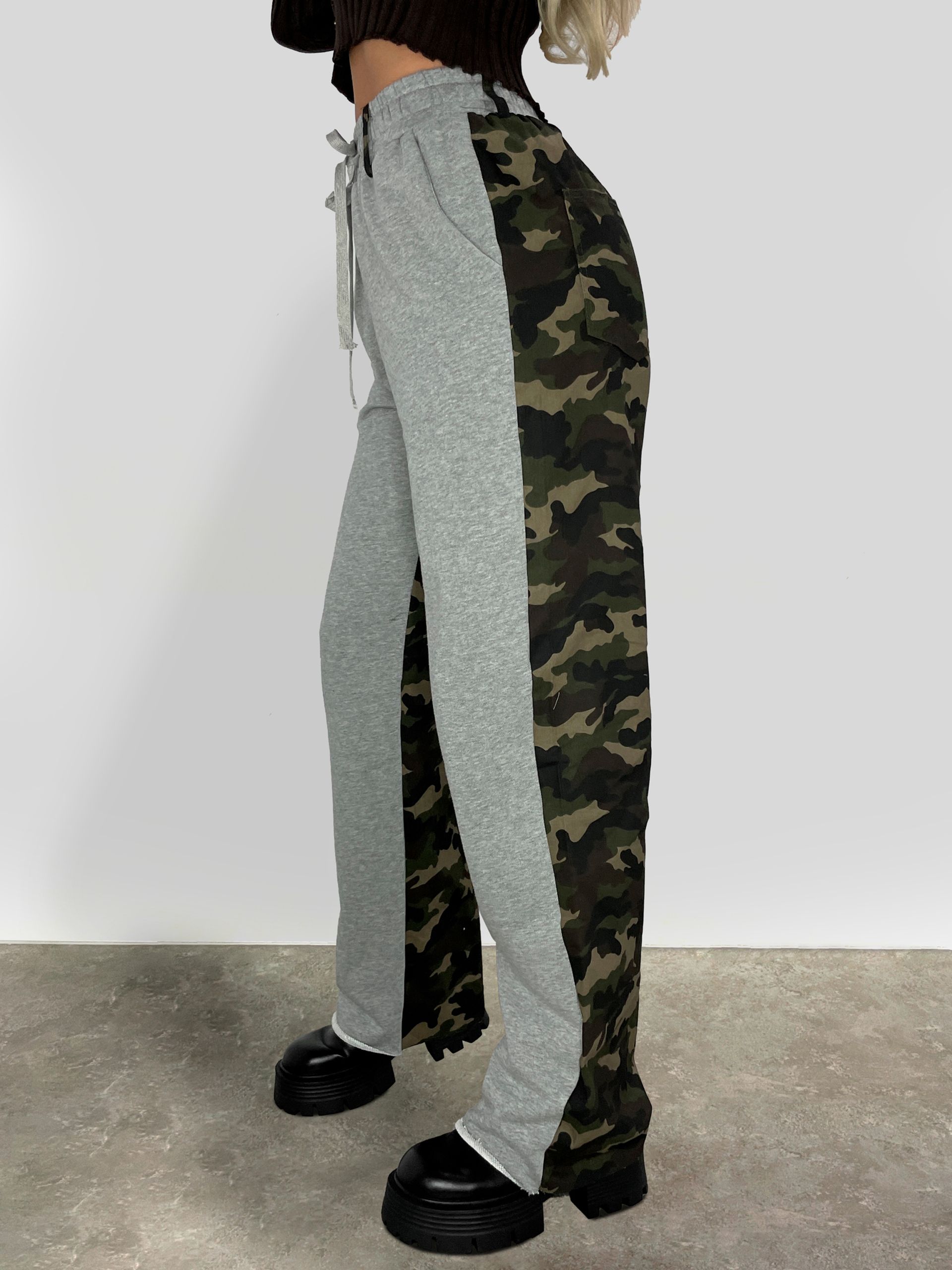 Особенность модели – двухцветные камуфляжные брюки с резинкой на талии с завязкой на шнурок, который можно затянуть по фигуре, и шлевки под ремень, что дает возможность носить эти спортивные брюки вместе с ремнем.