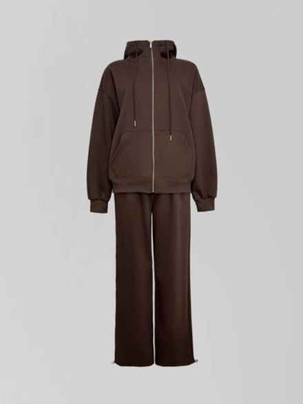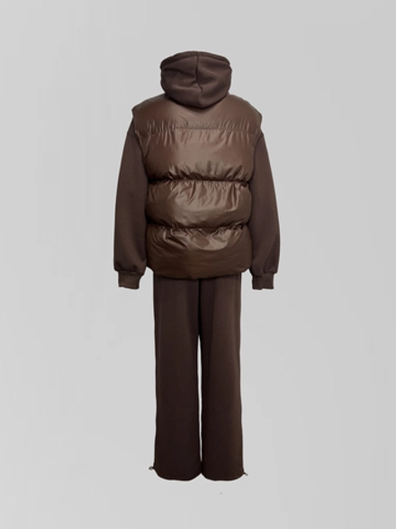 Данный комплект, состоящий из жилета, удобной кофты на молнии и прямых брюк, становится идеальным решением для переменчивой демисезонной погоды. При его создании использовалась современная материя из смеси хлопка и полиэстера. Это сочетание не случайно: оно дарят телу приятные тактильные ощущения, свойственные натуральным волокнам, и при этом сообщает костюму износостойкость, способность долгое время сохранять опрятный вид без деформации даже при активной эксплуатации.