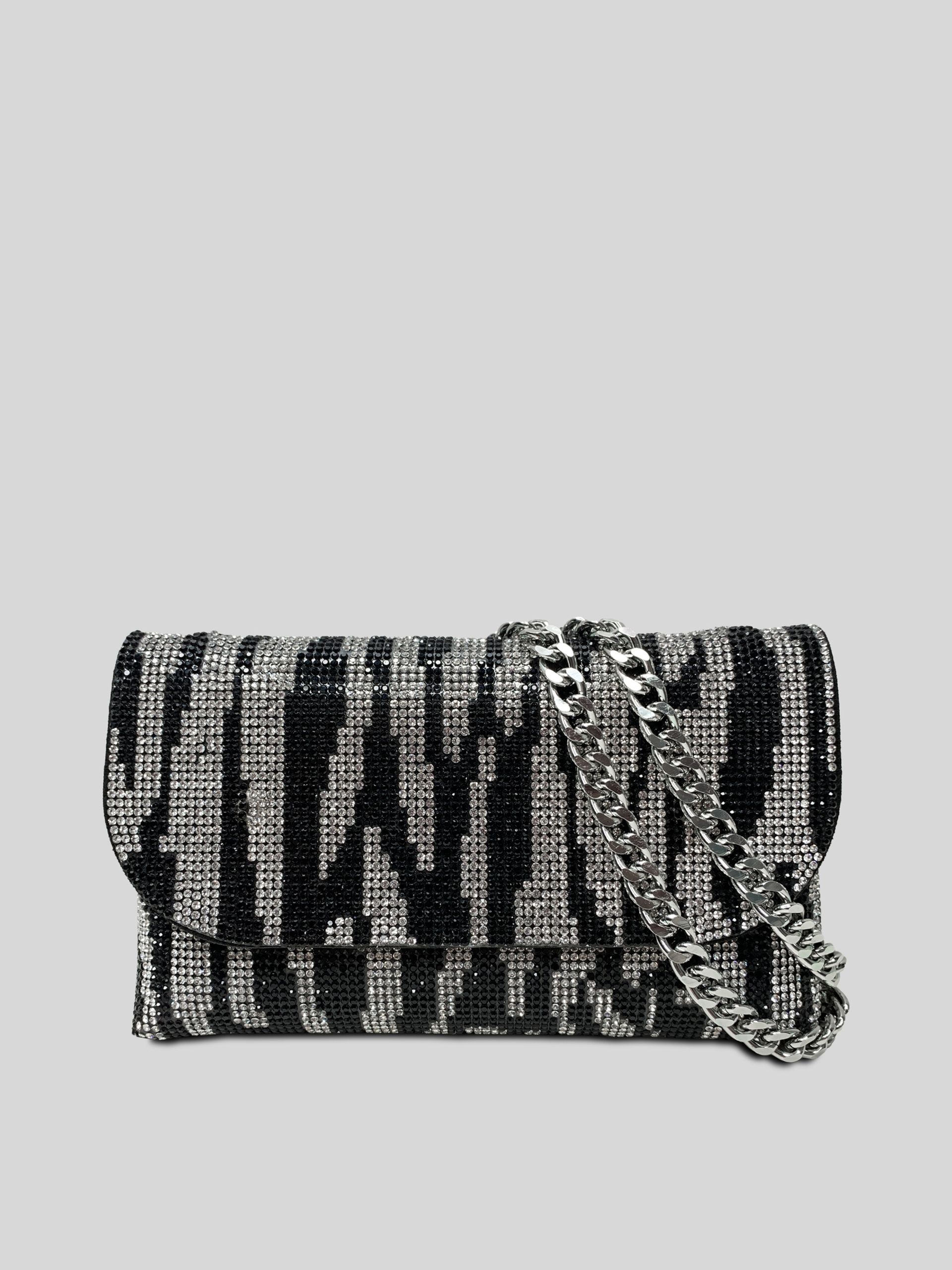 Женская сумка-кошелек, маленького размера из кожзама и мелких страз с принтом зебры и металлическим ремешком в виде цепочки