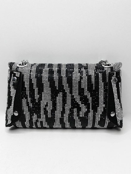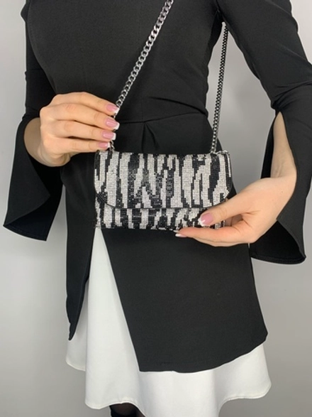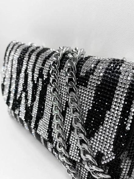 Женская сумка-кошелек, маленького размера из кожзама и мелких страз без принта и металлическим ремешком в виде цепочки