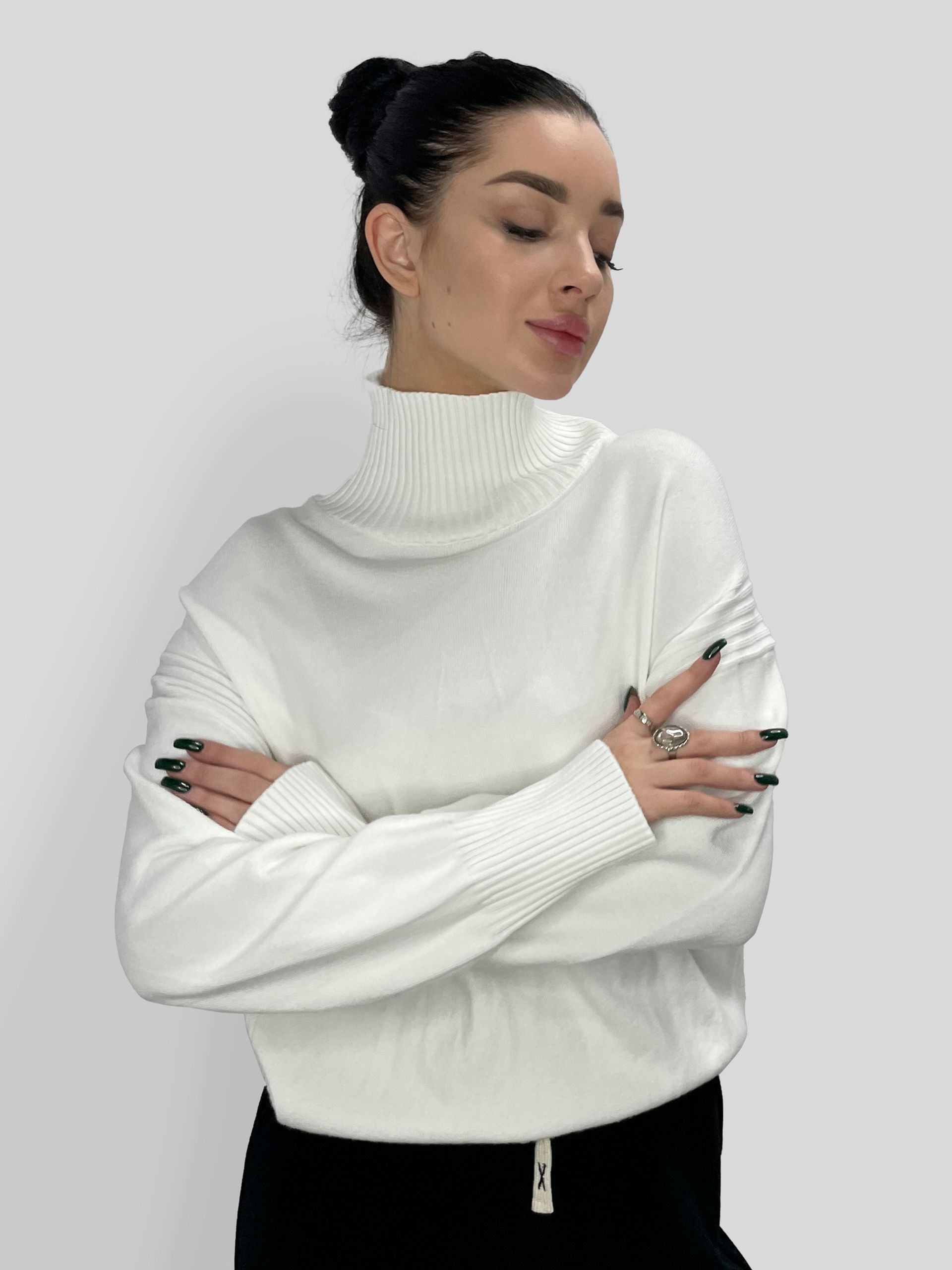 Женский свитер 30230 из однотонного трикотажа с высоким горлом, широкой резинкой на манжетах и внизу, стандартной длины