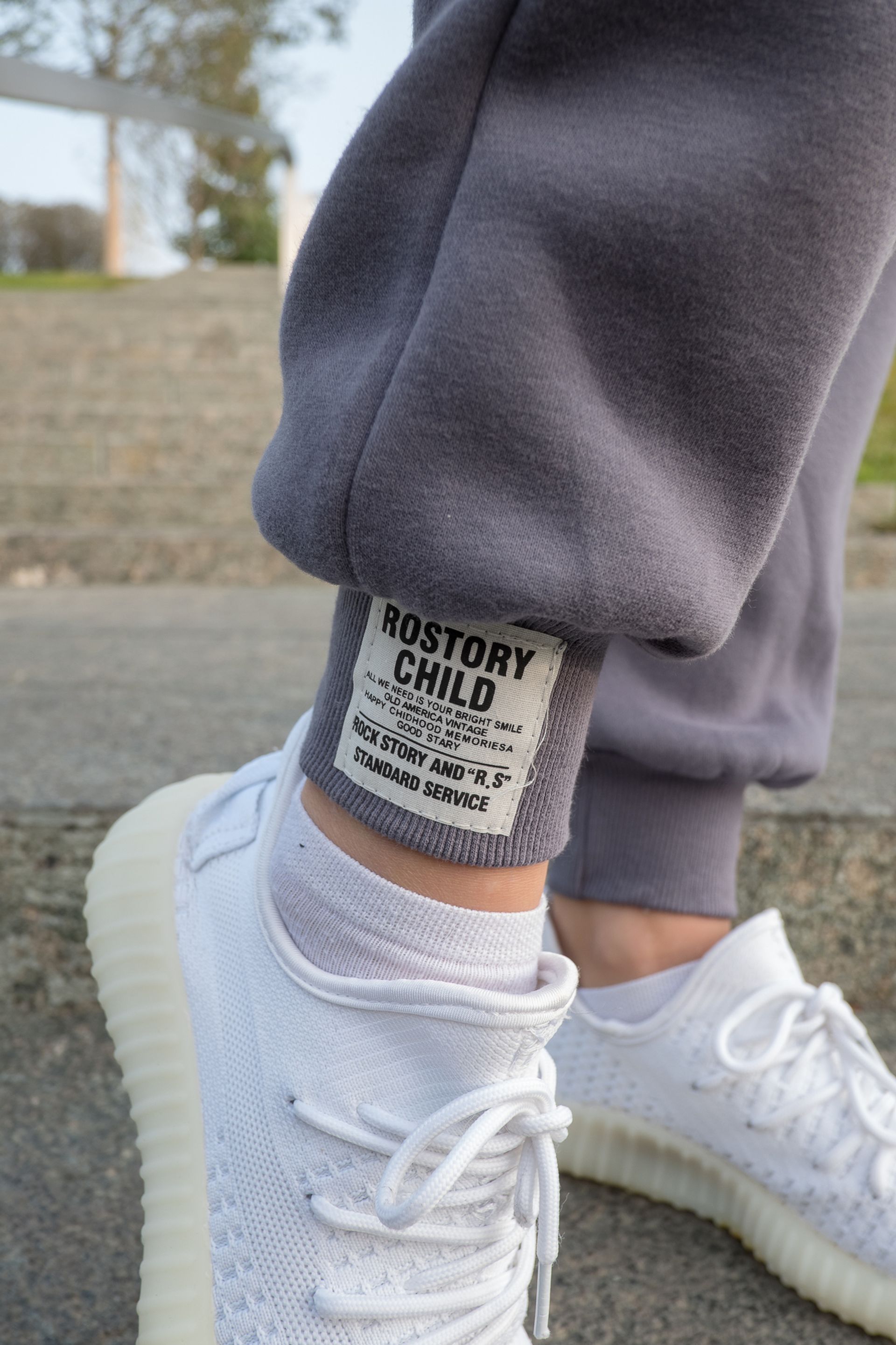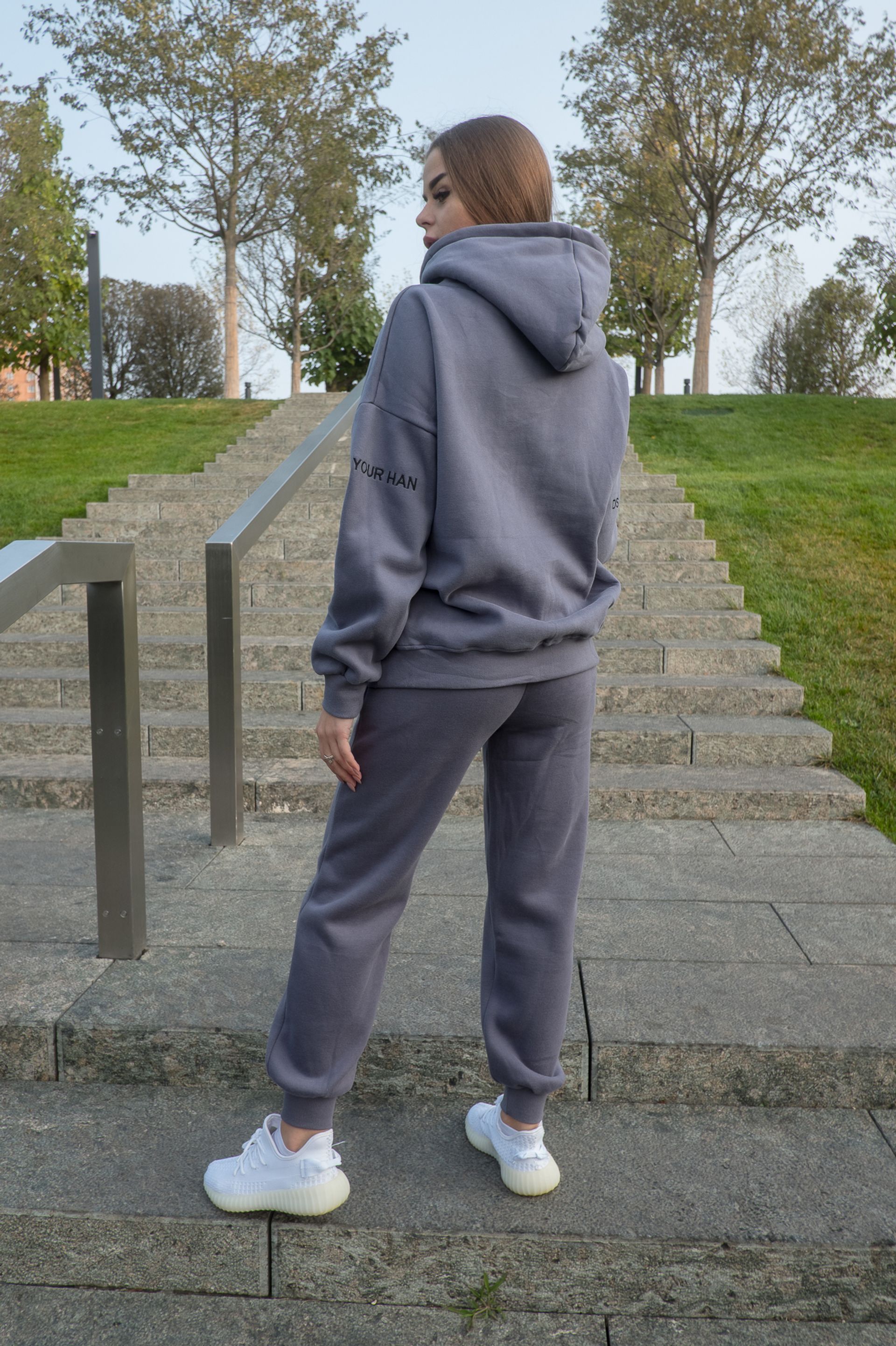 Женский спортивный костюм серого цвета из трикотажа и с утеплителем из флиса, с капюшоном, надписями на рукавах и нашивкой на штанах