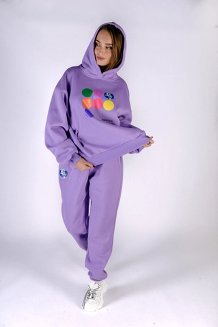 Женский спортивный костюм из хлопка бежевого цвета с утеплителем из флиса. С капюшоном. С резинкой на талии, внизу штанин и рукавах. С надписью на спине.