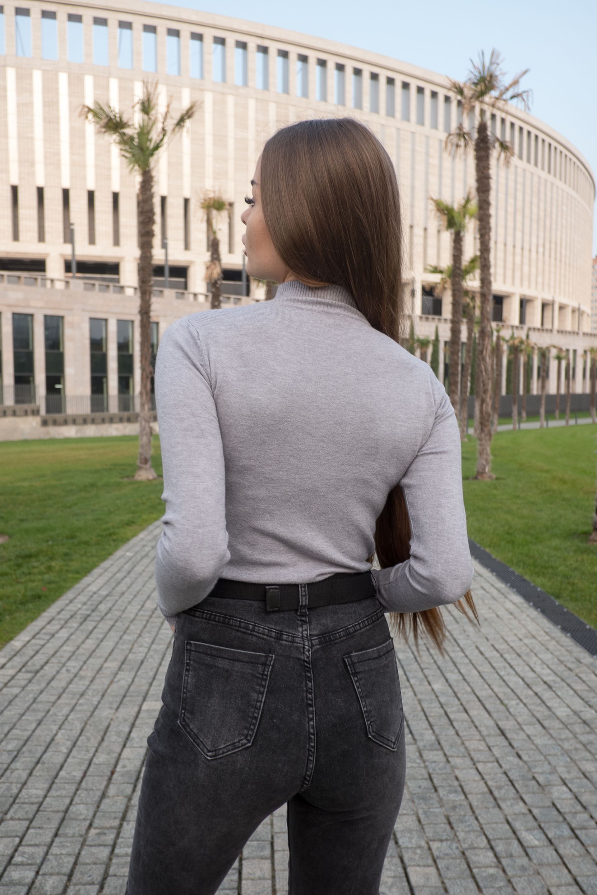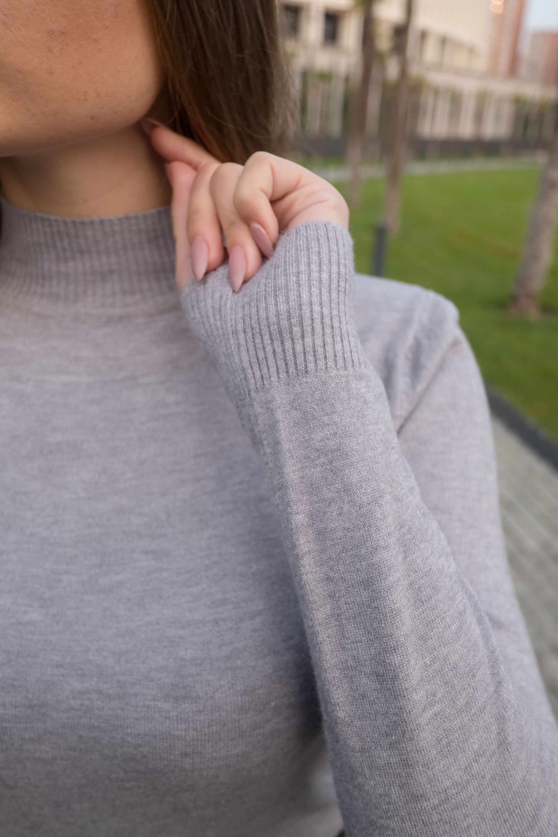 Женская водолазка серого цвета из трикотажа, с длинными рукавами