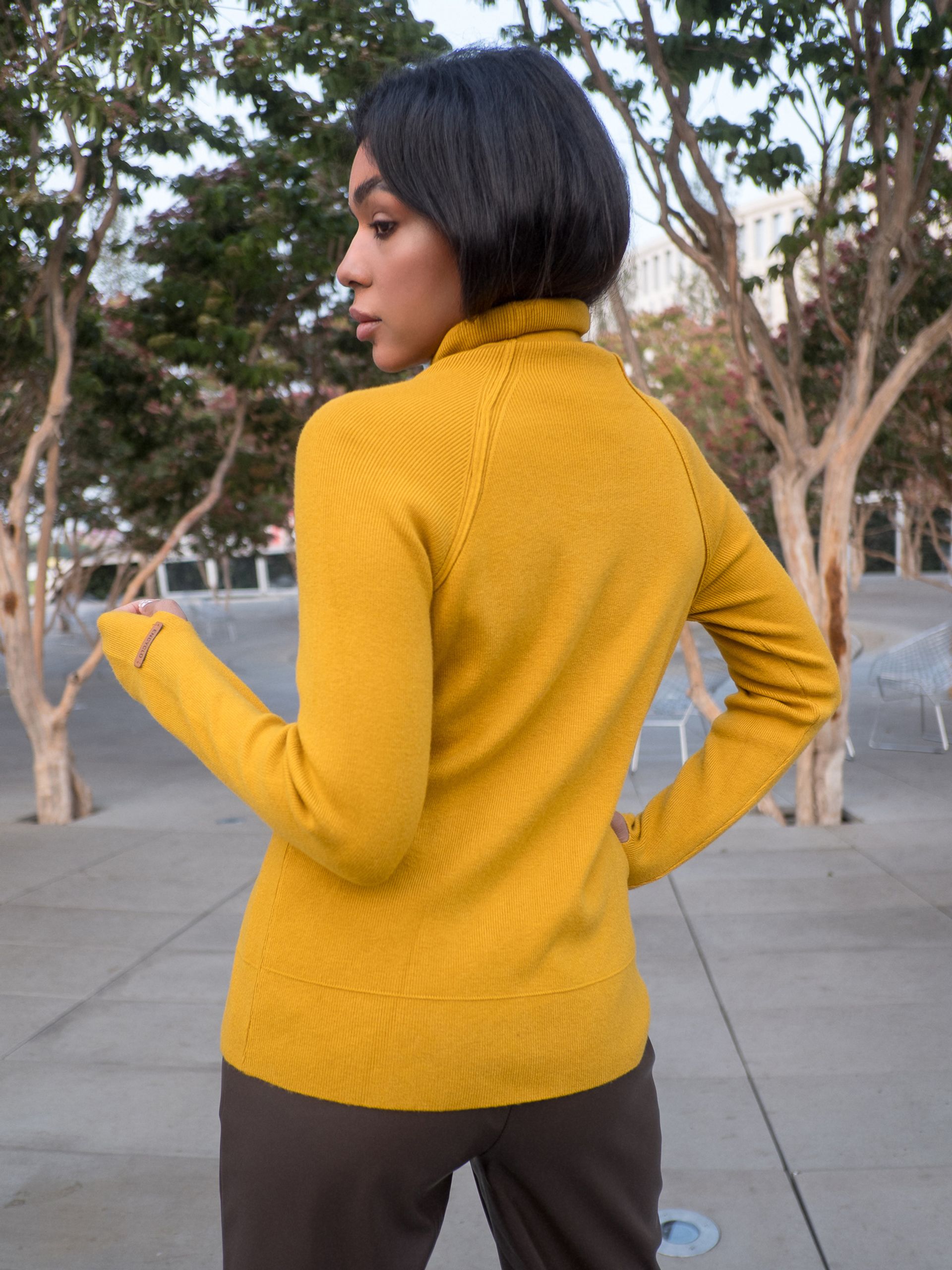 Женская водолазка желтого цвета из трикотажа, с высоким горлом, с маленькой табличкой на левом рукаве и вырезами для больших пальцев